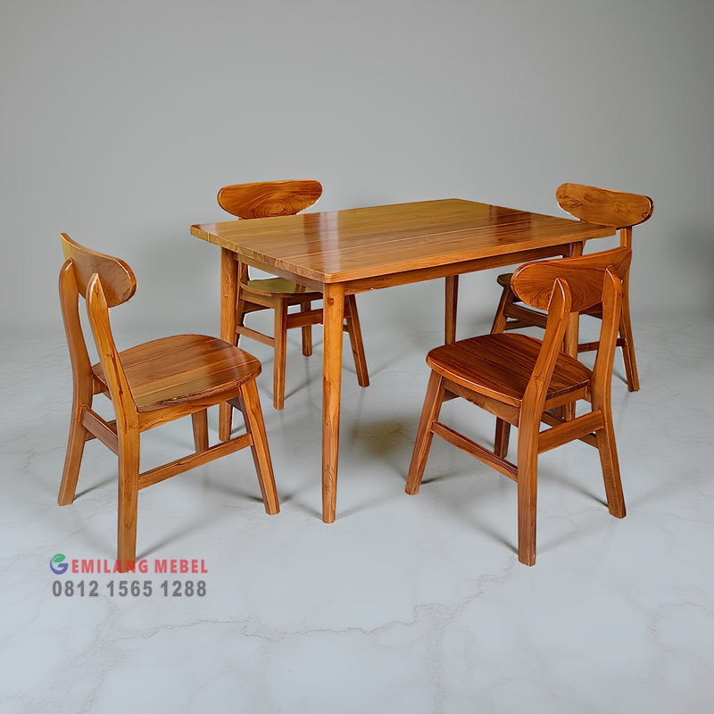 Temukan meja kursi cafe Majalengka harga murah dengan kualitas terbaik dari pengrajin mebel Jepara, hadir dengan komposisi 1 meja panjang ukuran 120 x 80 cm dan 4 kursi makan yang kokoh, terbuat dari kayu jati pilihan yang awet dan elegan. Set meja kursi kayu jati ini sangat cocok untuk cafe, restoran, maupun rumah makan di Majalengka yang mengutamakan kenyamanan, desain natural, serta daya tahan jangka panjang. Produk ini langsung dibuat oleh pengrajin mebel Jepara berpengalaman sehingga menghasilkan finishing halus, tampilan estetik, dan harga yang tetap terjangkau untuk kebutuhan usaha Anda.