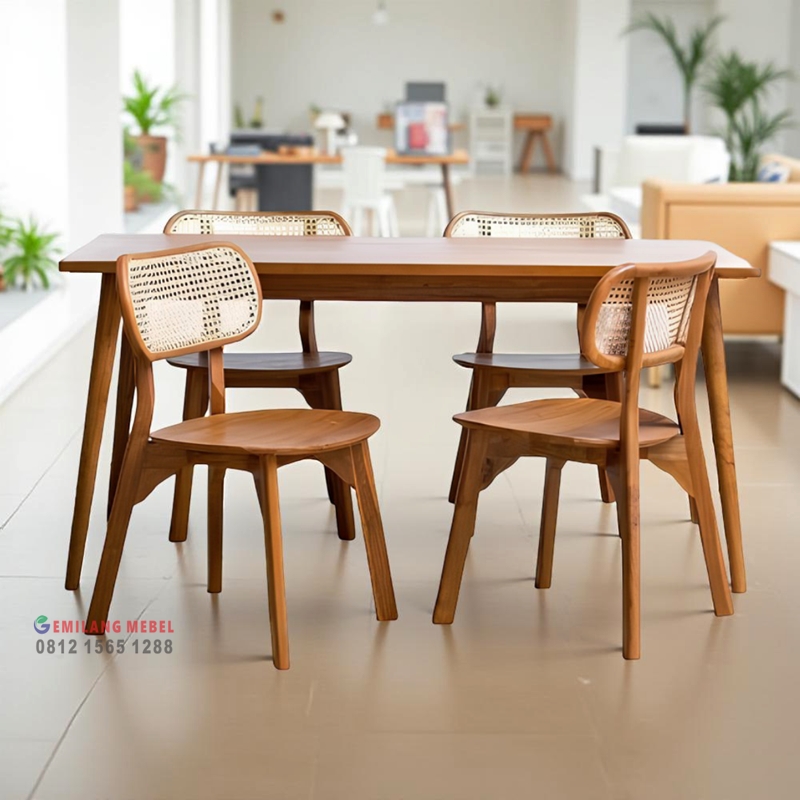 Anda sedang mencari meja dan kursi makan area Cibinong yang elegan dan awet? Kami menghadirkan set 1 meja panjang 140 x 80 cm dan 4 kursi makan berkualitas, terbuat dari kombinasi kayu jati asli dan rotan pilihan dibuat oleh pengrajin mebel Jepara berpengalaman. Desain kokoh sangat cocok untuk ruang makan rumah minimalis, cafe, maupun resto yang mengutamakan kenyamanan dan keindahan. Dengan finishing rapi dan material premium, produk meja kursi makan Cibinong ini tidak hanya fungsional tetapi juga menambah kesan mewah.