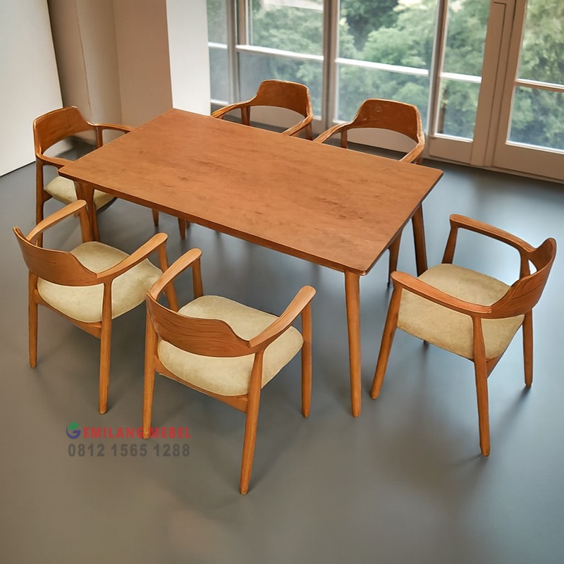 Meja kursi resto Jakarta kini hadir dengan desain elegan dan bahan berkualitas tinggi dari kayu jati asli Jepara. Set meja makan ini memiliki ukuran meja panjang 160 cm lengkap dengan 6 kursi kayu jati yang dilengkapi bantalan busa empuk, memberikan kenyamanan maksimal bagi pelanggan restoran, kafe, atau rumah makan Anda. Finishing halus dan kuat menjadikan tampilan set ini tampak mewah dan tahan lama untuk penggunaan jangka panjang. Produk meja kursi resto ini dijual dengan harga murah langsung dari produsen mebel Jepara tanpa perantara, sehingga Anda mendapatkan kualitas premium dengan harga terbaik. Sangat cocok untuk konsep resto modern, minimalis, maupun klasik.